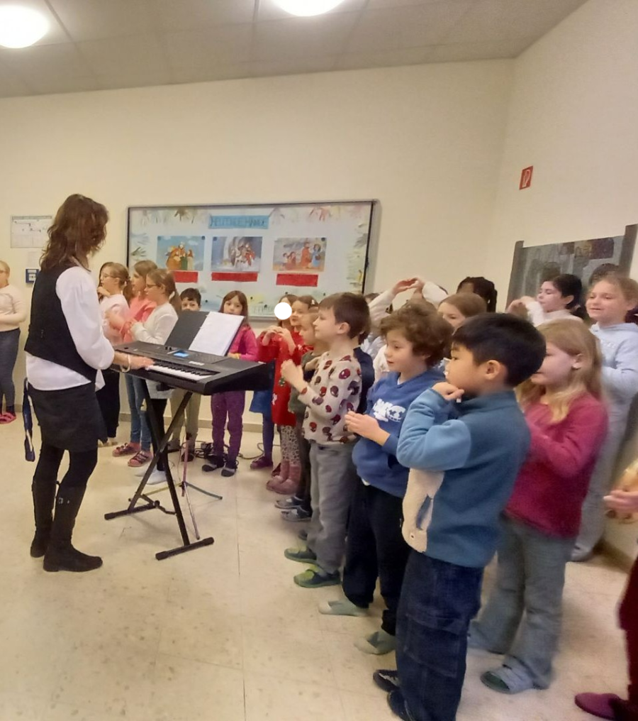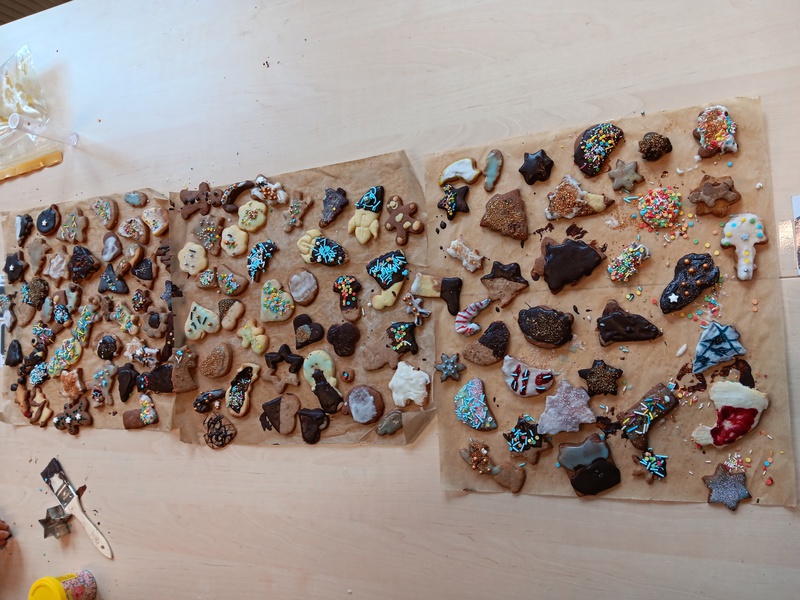 Der letzte Tag vor den Ferien begann wieder mit einer Schulversammlung. Unser Chor stimmte uns ein. Anschließend begleitete die Klasse 3c die Zuckerfee aus dem „Nussknacker“ musikalisch. Die Klasse 4a erinnerte uns mit einem Lesestück daran, dass Weihnachten für uns alle ist und sang passend dazu noch „Zünd ein Licht an“. Zwei Mädchen aus der 4b hatten eine eigene Geschichte über den Weihnachtsmann, der in Gefahr ist, geschrieben und lasen diese uns vor. Unter Jubel wurde verkündet, dass das Sozialziel, sich ordentlich anzustellen, von allen Klassen geschafft wurde und es daher nach den Ferien an einem Tag hausaufgabenfrei gibt. Unser neues Ziel ist, Konflikte in Giraffensprache zu lösen. Zum Abschluss der Versammlung wurde noch gemeinsam „In der Weihnachtsbäckerei“ gesungen.