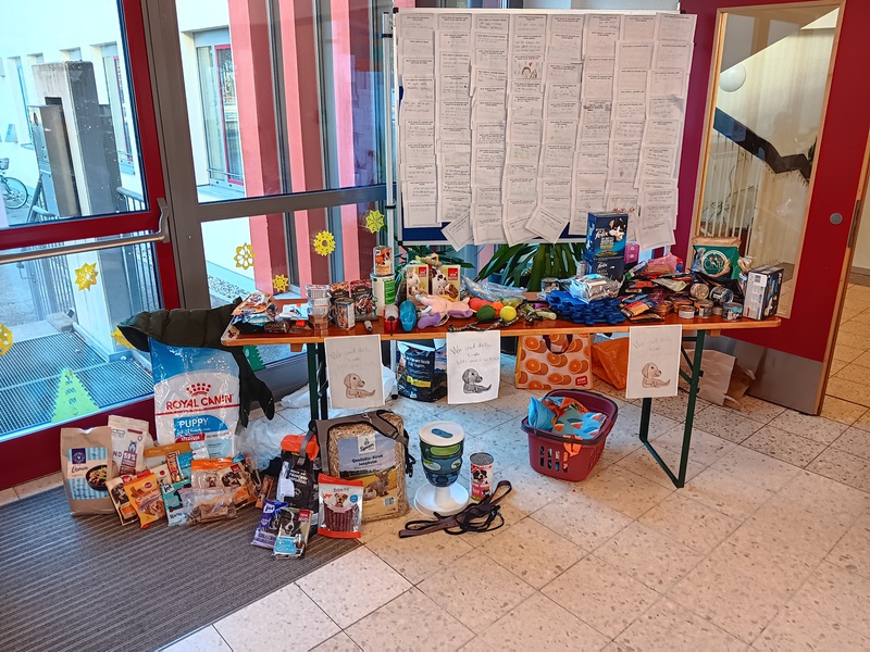 Ein paar Mädchen aus der Klasse 3b hatten zudem die Idee, Futterspenden für den Tierschutz FFB zu sammeln. Sie organisierten die Sammlung auch weitgehend selbstständig. Es wurde so viel gespendet, dass der Tisch nicht ausreichte. Vielen Dank an alle, die diese Aktion unterstütz haben und Futter oder Tierbedarf gespendet haben!